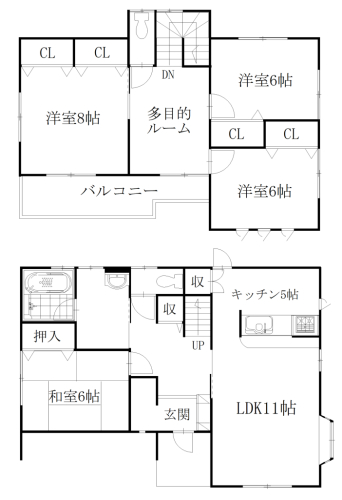 1階 LDK11帖、和室6帖、2階 洋室8帖、洋室6帖、洋室6帖、多目的ルーム |