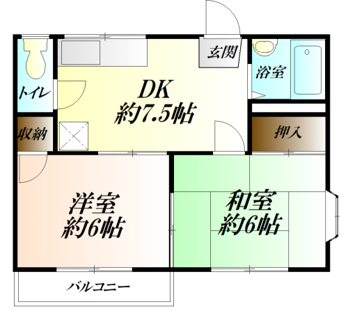 洋室6.0帖、和室6.0帖、DK7.5帖、バス、WC |