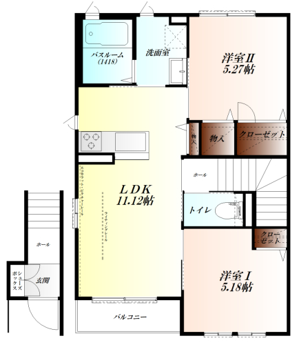 洋室5.27帖、洋室5.18帖、LDK11.12帖 |