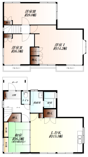 【1階】15.3帖、和室6.5帖、バス、WC【2階】洋室14..2帖/9帖/6.5帖 (1帖=1.62㎡) |