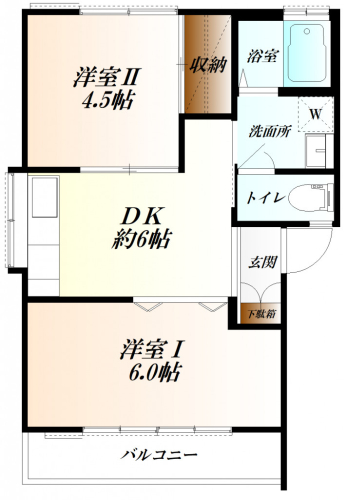 洋室6帖、洋室4.5帖、DK6帖、バス、WC |